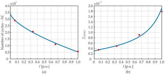 Influence of the normalized battery current: (a) number of cycles and (b) fΔSOH,I.