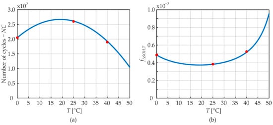 Influence of the temperature: (a) number of cycles and (b) fΔSOH,T.