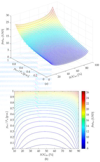 To demonstrate the application of the proposed battery degradation cost model, an example is carried out considering a BESS with the parameters listed in Table 2. Based on them, it can be found by Equation (2) that the rated battery time Tn for a complete charge or discharge is equal to 1.2 h. Therefore, taking into account the empirical curves and equations established in this section, it is possible to plot the cost model as a function of the dispatch battery power and the current state of charge, as illustrated in Figure 5.