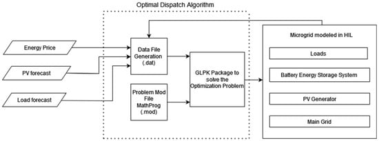 Figure 7 depicts how the proposed algorithm was implemented in this study. The microgrid was modeled from existing Typhoon HIL components. The optimization problem, variables, constants, and parameters were defined in the “Problem Mod File” in MathProg. The values for the problem parameters are generated at each time step in “Data File Generation”. These two files are input into the GLPK package, which solves the optimization problem. In sequential order, the optimal dispatch algorithm receives input data of energy prices, photovoltaic generation forecast, load forecast, and initial conditions of the microgrid. The “Data File Generation” block receives these parameters, creating a .dat file, and inserts it into the solution block. Simultaneously, the block “Problem File Mod” with the .mod file inserts the problem to be solved. The solution of the optimization problem is sent to the microgrid, and, in this specific algorithm, it acts directly on the BESS dispatch. This process is repeated throughout the simulation period considered, which in the case of this study is 24 h.