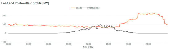 The tests are accomplished to analyze the battery dispatch in different scenarios and to verify the behavior of the state of charge in each situation. In summary, three test packages are carried out: in the first, a variation is applied in the contracted demand; in the second, a variation is applied in the initial investment of the BESS; and in the third, a variation is applied in the initial SOC. The load and the PV generation profiles are considered the same in all the tests, as shown in Figure 8. The simulation time for each scenario is 24 h, with dispatches and measurements realized every five minutes.