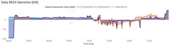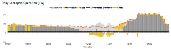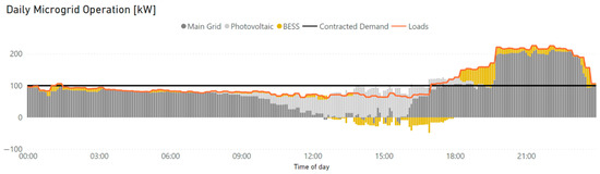 In the results of the daily operation of the microgrid, the power associated to the main grid, photovoltaic system, BESS, loads, and contracted demand are presented in a single graph for each sub scenario evaluated, as shown in Figure 9, Figure 10 and Figure 11, respectively. From these simulations, it is possible to check that the battery is activated to avoid excess demand charges. In summary, the battery bank operates in discharge mode to complement the generation when the load demand exceeds the contracted demand and operates in charge mode to absorb the extra power produced by the PV system when it exceeds the load demanded power.