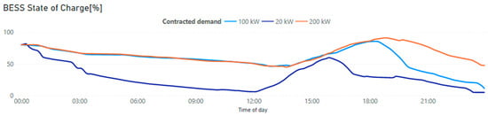 Figure 12 illustrates how the SOC varies over the time under the three contracted demand values listed before. As observed, when the contracted demand is reduced and there are not enough generation sources to supply the load, the battery is dispatched to avoid exceeding demand. As soon as other generation sources such as PV become available, the battery is recharged to be discharged at peak times. It is worth mentioning that if the contracted demand is much less than the load, the battery is dispatched despite the cost and despite the SOC, as the main objective of the optimization algorithm is supplying the load. Conversely, when the contracted demand is well dimensioned, the battery is dispatched only in the intervals of possible exceeding demand.