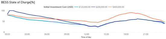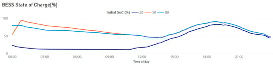 Finally, when the operation starts with the SOC at 80%, there is a gradual discharge of the battery during the first hours, so that the SOC decreases to a level of 50% at 12 pm. After that, the battery is charged with the excess of PV generation to be again discharged at peak hours, in order to complement the extra demand. At the end of the daily operation, the SOC is approximately 50%. It is noticeable that, regardless of the initial SOC of the BESS, during daily operation, while meeting the needs of the load, the SOC converges to a common point, close to the SOC of lowest battery degradation.