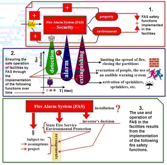 FAS implement the most important security functions within these facilities. This is associated with the protection of the life and health of people that use such buildings, the environment where the buildings are operated, as well as movable and fixed property stored in facilities supervised by FAS—Figure 1. All elements, devices and modules that are FAS operation components are necessary in the context of facility fire safety. Using FAS in given stationary or non-stationary facilities, and their proper operational supervision (e.g., implementation of preventive inspections within set time intervals) results from the relevant legal provisions applicable in individual countries—Figure 1 [1,7].