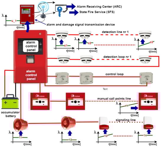 Conducting such a process makes FAS elements exhibit a constant damage intensity λ for a specific period of operation. However, the process requires conducting a computer analysis of actual FASs with elements of different damage intensity λ waveform within the operation process and determining reliability and safety parameters. Figure 2 shows a sample FAS with a focused structure, which includes selected detection lines and circuits with elements of various damage intensities λ, marked in this Figure with a sample waveform.