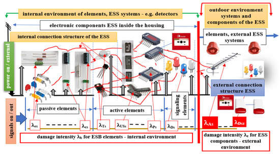 All FAS elements and devices operated within a given civil structure are always located within two different environments—external and internal. Figure 5 shows a simplified impact of this adverse environment on the operation process of individual FAS elements, devices or modules, through changing the damage intensity parameter λ for the aforementioned technical components [74].