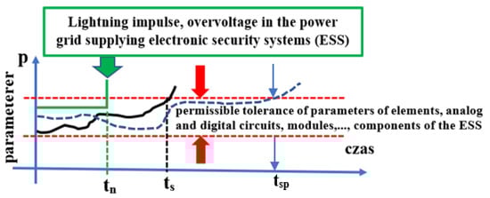 Continuous or step-wise change in the p parameters of FAS elements, systems, modules or devices, impacted by environmental changes, where: ts—damage time in the case of so-called ageing changes related to operation time, tn—time to damage upon pulsed actions causing unfitness—e.g., supply grid overvoltage, occurrence of an atmospheric discharge pulse, tsp—time to damage in the event of so-called ‘ageing changes’ related to operation time under favorable external environmental conditions.