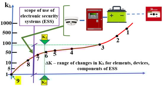 The impact of a changing environment on FAS elements and devices leads to changes in the p technical parameters used within the security system of technical facilities. Figure 7 shows a change in the damage intensity coefficient kλ for elements, devices or individual electronic circuits of FAS operated under various environmental conditions. Therein, the range of changes ΔK in the kλ coefficient, and the application range for FAS elements that are used in practice within such a security system is illustrated [79,80,81].