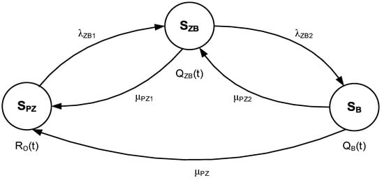 A transition from the state of safety unreliability SB to the state of full fitness SPZ is possible, however, it requires taking corrective actions covering the entire fire alarm system. The system shown in Figure 8 was described by the following Chapman–Kolmogorov equations (expression (9)).