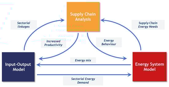 In Figure 2, a set of possible interactions between the tools, which summarize the approach, is outlined. As it is mentioned, in the presented configuration, IOA, a fit-for-purpose modeling approach of Industrial Ecology [], acts as a bridge between a robust characterization of the supply chain under investigation and detailed modeling of the energy system. Indeed, thanks to the exchange of information between SCA and IOA, (as the outputs of the SCA are input for the IOA), it is possible to evaluate impacts at the social, economic, and environmental levels of the formulated improvement strategies. Furthermore, the integration of results between IOA and ESM permits us to formulate an energy strategy ad hoc for these interventions, addressing sustainable development objectives.