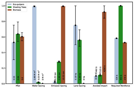 Figure 5 represents an exhaustive summary of the Integrated Multidimensional Analysis, including six indicators by which the impact of various applied interventions is compared. In the following, a detailed description of the change in each indicator by the proposed strategies is reported.