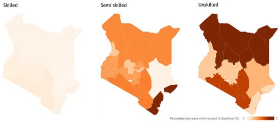 As shown in Figure 6, investments in the coffee sector trigger labor increases in other sectors all over Kenya, but the main change is associated with the increase in demand for low-skill workers in the north area of the country (see public.flourish.studio/visualisation/3338282/ accessed on 1 April 2022 for the interactive version of the map). It can be inferred that policies that aim at increasing the occupation level in the most vulnerable population share should be driven towards the coffee sector. This is particularly relevant since higher shares of unemployment are among unskilled workers and the northern part of the country is the one with the lowest wealth relative index []. Figure 6 shows, in particular, how from the optimal allocation of the $100 m investment, unskilled workers in the northern regions of the country are the category that benefits the most.