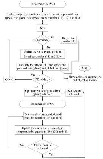 The PSO results are further improved by using the SA algorithm, such as the global best from PSO being taken as the old solution given in Equation (16). The new solution is achieved by putting the old result in the new function given in Equation (17). Equation (18) tells us about the difference between the new and the old solution; when the delta is less than 0, the new solution becomes equal to the old solution and it is called a good move. The good solution is passed through the cooling function given in Equation (21) and the required results are achieved. If the delta is greater than 0, then the solution will pass through the probability equation given in Equation (19) and it will continually move through that equation until it satisfies Equation (20). By following these steps, the local optima is removed and the global best solution is achieved. The abbreviations (P, D, and T) used in the Equations (16)–(21) are the probability, the difference between the two variables and the temperature, respectively, whereas is a random number from 0 to 1. The initial temperature is T0 and α is the cooling factor. is the new temperature, α is the cooling factor, and is the previous temperature. The value of the initial temperature () is 1 and the cooling factor (α) is 0.99.