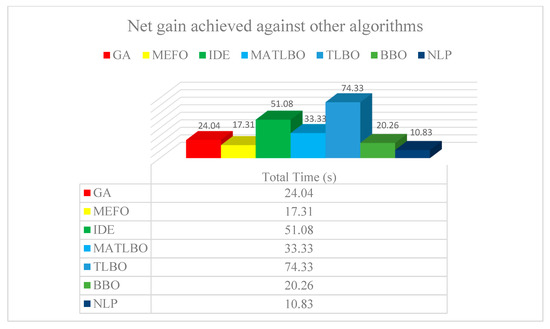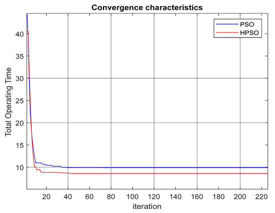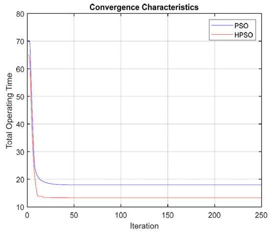 It is noted that the proposed PSO and HPSO algorithm performs better than the GA, MEFO, BBO, NLP, MATLBO, TLBO, and IDE algorithms. This is because PSO has an exceptional quickness and exploration capability to trace the fault, and the addition of SA in the algorithm helps to improve the optimal solution. The operating times of individual relays by using the optimized values of the TMS are given in Table 5. The analysis of the net gain of the HPSO with the other defined techniques is displayed in Figure 3, which justifies that this technique is better than the other optimization techniques. The convergence graph of the PSO and HPSO are given in Figure 4 after the simulation with the help of MATLAB.