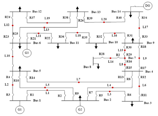 The IEEE 14-bus system is shown in Figure 5, which consists of one DG, 3 generators, 20 fault points (L1, L2, L3, …, L20), 14 buses (Bus 1, Bus 2, …, Bus 14), and 40 relays (R1, R2, R3, …, R24). There are 92 combinations among these 40 primary–backup relays. One DG is connected at bus 14 and three generators are connected at buses 1, 2, and 6, respectively. The current transformer ratios (CTR) for all the relays for this bus system are given in Table 6. The relationships between the primary and backup relays at different fault points for all the 92 combinations of relays are given in Table 7. The fault currents for all the 40 relays either passing through the primary relay or from the backup relay are given in Table 8.