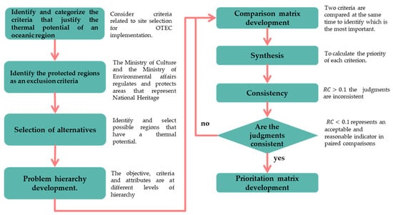 Finally, the prioritization matrix of alternatives is presented. In this, it is possible to justify and identify the best alternative within the oceanic territory where the OTEC plant must be installed. In Figure 2, we can see a flowchart corresponding to the methodology addressed in this research.