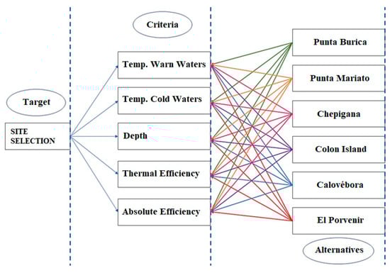 Next, Figure 3 shows the diagram corresponding to the problem under study. The main objective is to guarantee the operationality of OTEC in the oceanic territory of Panama, sustainably responsible for the environment, and that complies with Panama’s legislation. In addition, the alternatives of interest and the criteria used in the analysis and development for the selection were identified.