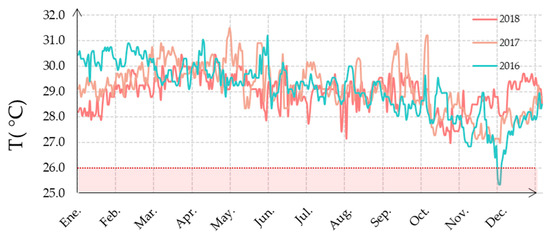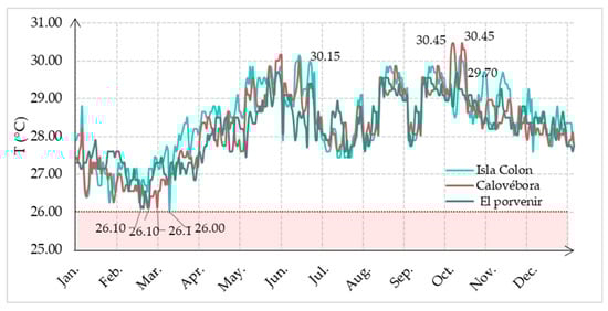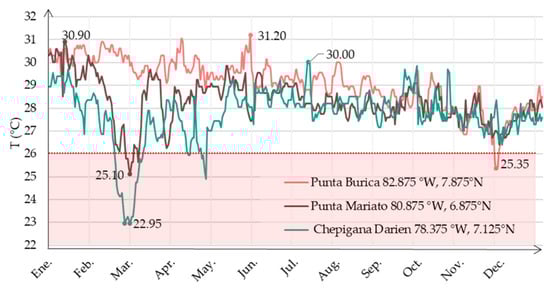 In Figure 4, the annual behavior of the surface temperatures corresponding to the three selected sites in the Panamanian Pacific can be observed, SST ≈ 26 °C was considered, this being a reference as the adequate SST for OTEC systems to show an efficiency actual acceptable [18,31].