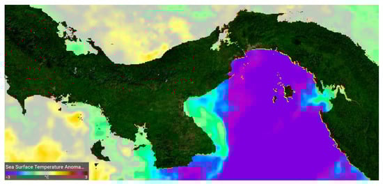 The most negligible temperature anomalies for shorter periods were recorded in Punta Burica. During this period the SST reached values approximately 31 °C being higher al recommended in his research [3,32]. The SST of Punta Mariato did not reach the maximum temperatures observed in Punta Burica (31 °C), but they were very close 30.90 ± 0.01. This site shows disturbances that are manifested during March, as shown in Figure 5, corresponding to the annual anomalies of the SST of Panama’s Pacific coast. The Gulf of Panama experienced changes in its SST of approximately 3.0 °C, corresponding to the purple color and the PODAAC scale.