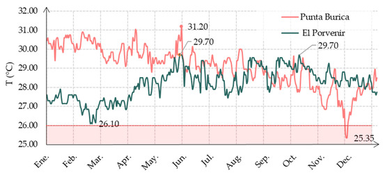 As shown in Figure 4, Punta Burica reaches less than 26 °C during a short period during December; however, the temperature remained above this reading from that month. The difference in these variables between these two sites is not considered from a quantitative point of view. Therefore, it would be necessary to consider other variables to select a site with the best conditions to implement OTEC technology.