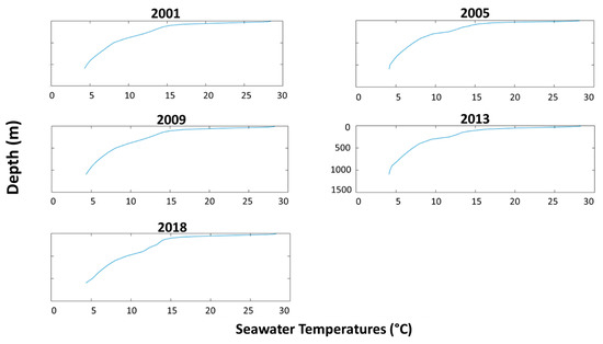 2.6. Temperatures of Cold Sea Waters (SST) and Depth