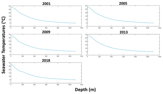 In the particular case of implementing this technology in order to generate electricity, pumping systems consume approximately three-quarters of the production of the design [15,30,39]. Therefore, if the site of interest hosts cold waters at depths greater than those recommended [1,31], the system will have to overcome a greater hydrostatic force in the suction line; thus, the consumption by the pumping system will increase, and the net production of the system will be reduced, which could reduce the sustainability of the system [1,15,40,41]. Figure 9 and Figure 10 show that the thermoclines for Punta Burica in the Pacific and El Porvenir in the Caribbean Sea, respectively, can be observed for five annual periods.