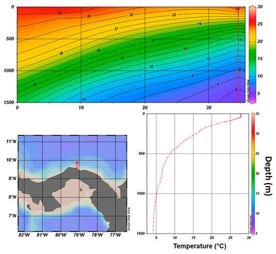 The most considerable ocean thermal energy is hosted near the Equator [3,4,5]. Geographically, Panama is located in Central America, bordering the Caribbean Sea and the Pacific Ocean, between 7° and 10° North latitude and 77° and 83° West longitude. Therefore, Panama’s ocean scenario displays thermal energy resource potential [6,7,8]. However, since Panama has a broad oceanic scenario, knowing its location is not enough to guarantee the sustainability of implementing marine energy exploitation, such as OTEC (ocean thermal energy conversion).