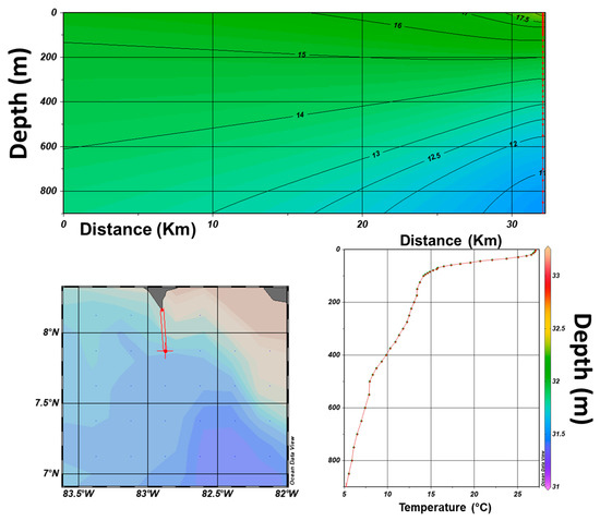 The variable temperatures of cold waters of the deep sea are directly linked to depth. For the operationality of OTEC systems, waters with temperatures of approximately 4–5 °C needed and these are housed at depths on average between 700–1000 m [1,11,37,38]. In previous research such as OTEC Alternative for the Electric Power Generation in Panama, we can observe the bathymetric map of Panama and identify where these waters are housed [5].
