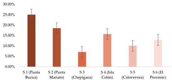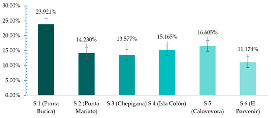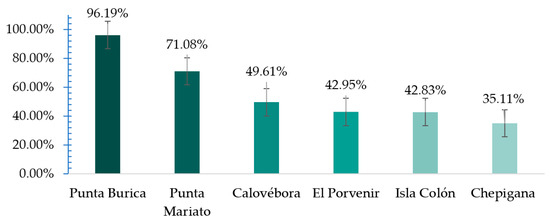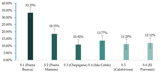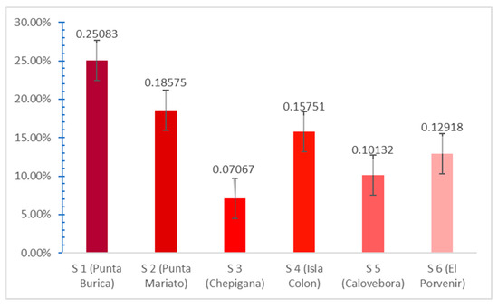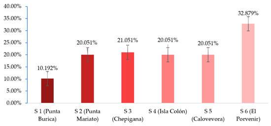 Figure 17 shows this panorama corresponding to the prioritization of this indicator, where Punta Burica and site two (Punta Mariato) present the highest percentages of hierarchy, 24.55%, and 22.76%, respectively, both located in the Pacific Oceanic scenario. Site three (Chepigana), which is located in the Gulf of Panama, registers a minimum of 6.38%. For this case, the results show the reliability of approximately 95%.