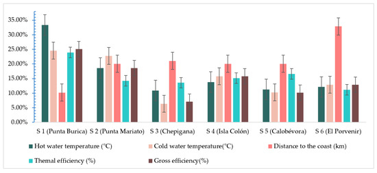 This indicator considers the turbine’s efficiency, which induces certain losses due to the continuous use of this element, reducing the production of electrical energy. The analysis corresponding to this can be seen in Figure 16. As for the evaluation corresponding to the gross efficiency criterion, considering all the alternatives, the picture is similar for the case of thermal efficiency, where site one (Punta Burica) presents the highest hierarchy with a percentage of 25.083% and site three with the minimum registered of 7.067%. These results reflect an error rate of approximately 4%, giving us reliability of 96% when considering this criterion individually.