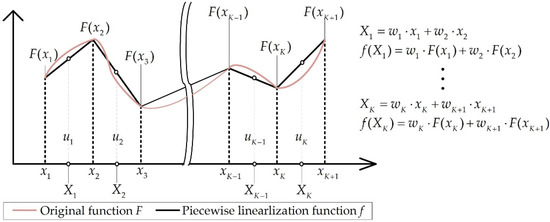 SOS2 is a general linearization method for nonlinear functions and is used to convert nonlinear optimization problems into MILP forms. The value of the point at which the slope change occurs is the change point, and SOS2 proceeds with piecewise linearization as the sum of the weights of the change points at both ends of each interval. Figure 1 depicts the process of expressing the piecewise linearization function of the nonlinear function using the SOS2 method. As shown in Figure 1, the variable , which exists in the interval , can be calculated by using the near change points and of the interval and their weights and . Because is linear in each interval, it can also be expressed as a linear sum of the weights and , as shown in Figure 1. This SOS2 process is expressed by Equations (7)–(11) as follows [18]: