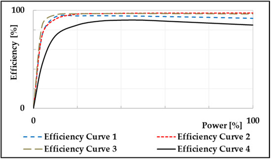 As described in Section 2, three efficiency values , , and must be considered to calculate the current stored energy of battery over time in accordance with the charging/discharging powers and . In this study, the value of was constant and was focused on modeling the nonlinearities of and . The nonlinearities of and are mainly caused by the PCS battery characteristics. Figure 2 shows the PCS efficiency curves of BESS as introduced in other studies [19,20,21,22].