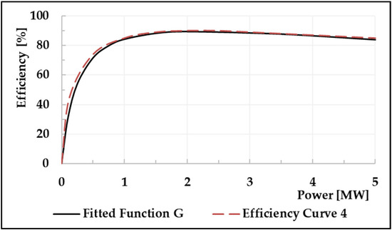 The efficiency value of the change points in Table 3 was obtained from [22], as shown in Figure 2. Based on this data set, the coefficients , , and of the nonlinear function introduced in Equation (12) were derived as 0.2326, 0.0477, and 0.9042 through curve fitting. This fitted function is plotted in Figure 4. To present the characteristics of the function assumed more efficiently above, the change point sets the interval more closely in the low-output interval with a large change in value. At this time, as mentioned in Section 3.2, the change point applies the nonlinear functions and as shown in Figure 3, and not or , to eliminate the nonlinearity problem.