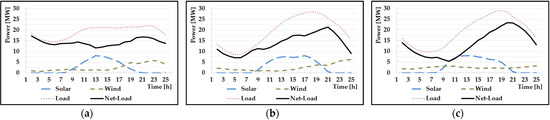 Load and renewable energy generation patterns for scenarios (a) A, (b) B, and (c) C.