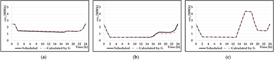 In this section, the results of each scenario were analyzed and verified by comparing them with the results obtained when nonlinearity was applied. The charging/discharging energy of the BESS calculated based on Methods I and II for each scenario yielded an error with the actual value calculated based on function . This error increased the uncertainty regarding the energy available for power supply and the suppliable period. When the BESS is operated in an actual power system to solve this problem, a separate mechanism is required to correct the error between the planned and the actual schedules. The error correction mechanism leads to additional BESS operation costs. However, because a clear answer to the error-correction mechanism has not yet been presented, it is difficult to quantify the costs. Therefore, in this study, it was assumed that this error correction mechanism was not specified, and costs were consumed at a certain unit price to correct the stored energy error for each time period that occurred in the BESS. The assumed error correction unit price was determined to be $70/MWh considering the operating cost of the G4 power source, which could be operated and stopped freely in the microgrid presented in Section 4.1. The overall cost and BESS operating pattern for each case calculated in this way can be found in Table 4 and Figure 6, Figure 7, Figure 8, Figure 9, Figure 10 and Figure 11, respectively.