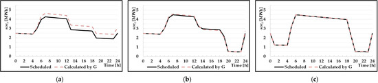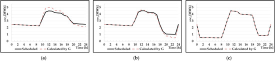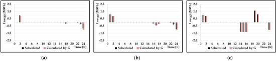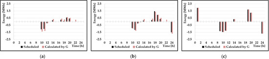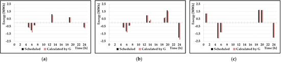 Case I80–B is similar to the actual value of compared with the value obtained in Case I70–B. This is attributed to the fact that the actual average charge power of Case I80–B was approximately 0.71 MW and the discharge power was approximately 1.05 MW. When this value is substituted in function , the efficiencies are approximately equal to 79% and 85%. These values are close to 80%. Accordingly, it can be observed that even if a constant efficiency is applied, a value that is similar to the actual result can be obtained. However, in Case I70–B, the operating range at 06:00 a.m. is approximately 3% outside of the upper limit of the operating range. This is because the actual charging/discharging-energy efficiency according to the charging/discharging power was 70% or more. The shown in Figure 8, is outside the upper operating range because the actual charging energy increases during charging and the energy used during discharging decreases. The actual charging/discharging energy is shown in Figure 9. This means that the optimal constant efficiency varies depending on the system status. In addition, it can be observed that the utilization of BESS increased compared with Scenario A which is presented in Figure 6.