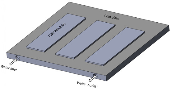 The external structure of the water-cooled plate is shown in Figure 1. Three IGBT modules are arranged on the upper part of the flow channel of the water-cooling plate. Based on the S-shaped runner, a spoiler column was designed inside the runner of the water-cooled plate to improve its heat transfer capacity. The cooling water flowing through the flow channel is disturbed by the spoiler column arranged in the flow channel, which enhances the turbulent flow effect of the cooling water, increasing the heat transfer coefficient of the water-cooled plate and increasing its heat transfer capacity. There are two cross-sectional shapes of the spoiler column that are rectangular and elliptical. In order to explore the influence of the spoiler column on the heat dissipation performance of the water-cooling plate, a water-cooling plate without an internal spoiler column was set up as a control group for the rectangular spoiler column water-cooling plate, and an elliptical spoiler column water-cooling plate. There were rectangular and elliptical spoiler water-cooling plates in the design group. The internal flow path structures of the three water-cooled plates are shown in Figure 2a–c.