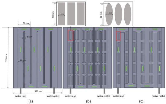 The internal structure of three types of water-cooled plates. (a) No spoiler column. (b) Rectangular spoiler. (c) Elliptical spoiler.