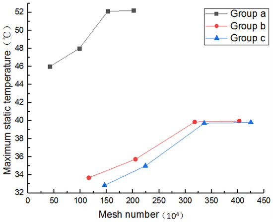 In order to improve the computational efficiency and ensure the accuracy of the model, a mesh independence test is needed. When the meshes of a, b, and c water-cooled plates were 2.01 million, 4.03 million, and 4.25 million, respectively, the maximum surface static temperature of the three water-cooled plates remained almost unchanged, as shown in Figure 3. Therefore, the final simulation results are based on the number of meshes at this time.