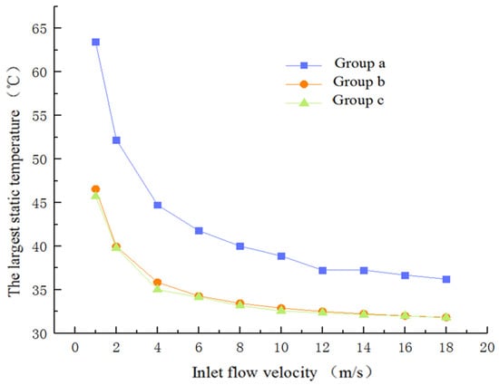 As shown in Figure 7, the maximum surface static temperature of water-cooled plates of b- and c-types in the design group is significantly lower than water-cooled plates of type a in the control group. By averaging the temperature difference values in the control and design groups at different inlet flow rates, we found that the average temperature difference between the b-type water-cooled plate and a water-cooled plate with different flow rates is 7.69 °C. The average temperature difference between the c-type water-cooled plate and a water-cooled plate with different flow rates is 7.73 °C.