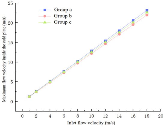 As shown in Figure 8, the arrangement of rectangular and elliptical spoiler columns in the flow channel causes some obstruction to the flow of cooling water. Therefore, the maximum internal flow rate of the two water-cooled plates in the design group is lower than the control group. Inside the design group, the cooling water is less obstructed in the streamlined structure of the elliptical spoiler column than in the rectangular spoiler column; therefore, the flow rate inside the water-cooled plate of the elliptical spoiler column structure is higher than in the rectangular spoiler column. The simulation results prove that the streamlined structure of the elliptical spoiler column is more advantageous in terms of the flow of the coolant inside the water-cooled plate. This advantage increases with the increase in the inlet flow rate.