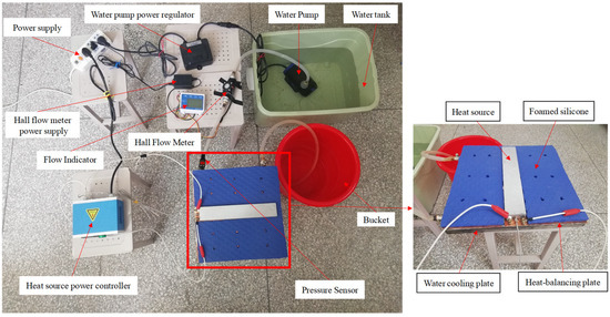 Based on the previous simulation results, an experiment was set to assess the cooling performance of the three designed water-cooling plates in real operation. In this section, we further investigate the cooling performance of the water-cooling plates by building an experimental platform and designing an experimental process. The experimental platform is shown in Figure 9.
