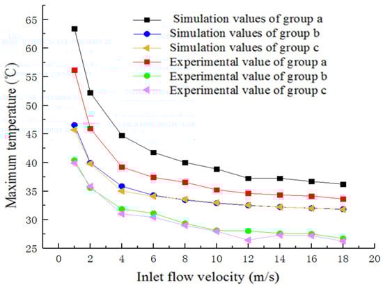During the experiment, the even heat plate was preheated for 5 min, then started to pass water to cool down the temperature. Twelve temperature measurement points were set up on the surface of the water-cooled plate. The temperature change of the measurement points was dynamic when the water passed to cool down. The temperature of each measuring point finally obtained its value in the steady-state. The temperature value of each water-cooled plate at different inlet flow rates was obtained as the average of the steady-state temperatures for 12 temperature measurement points. The statistical analysis results of the data are shown in Table 3. In order to verify the results of the previous simulation and compare the real heat dissipation capacity between the three water-cooled plates, the simulation values of the maximum static temperature and experimental values of the average static temperature of the surfaces for the three water-cooled plates at different inlet flow rates were plotted and analyzed. The results are shown in Figure 10.