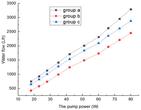 We set this indicator to investigate the obstruction effect of different spoiler column structures on the water flow. However, the actual measurement of the flow rate inside the water-cooled plate is difficult to obtain. By measuring the size of the flow rate through different water-cooled plates while the pump was running at different powers for 30 min, this purpose could also be achieved. The experimental numerical statistics are shown in Figure 11.