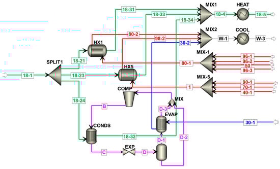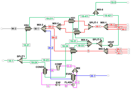Schematic of the process model for the wastewater heat recovery system. Abbreviations: COMP, compressor; CONDS, condenser; EVAP, evaporator; EXP, expansion valve; HX, heat exchanger; HEAT, (heater); COOL, (cooler); MIX, mixer; SPLIT, splitter.