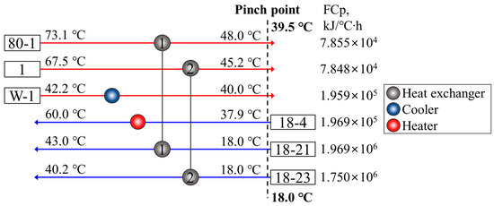In Figure 5, ‘80-1’ indicates the collected wastewater from 1–4 stages of the textile industry, ‘1’ indicates the collected wastewater from 6–8 stages of the textile industry, and ‘W-1’ indicates the collected heat exchanged wastewaters through the heat exchanger and heat pump’. ‘18-4’, ‘18-21’, and ‘18-4’ indicate the split freshwater. The temperature changes of streams by heat exchange are shown in the front and backward of the heat exchanger.