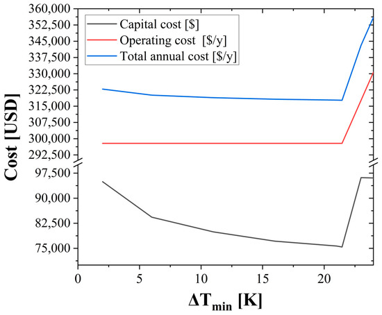 Cost targets of the HEN in the wastewater heat recovery system relative to the change in minimum allowed temperature difference (∆Tmin).