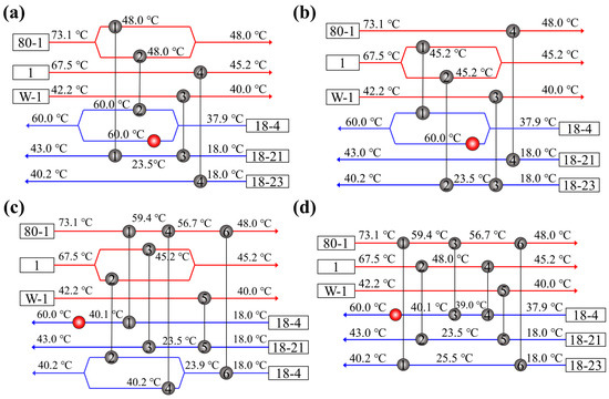 Grid diagrams of the retrofitted HEN in the wastewater heat recovery systems: (a) design a; (b) design b; (c) design c; (d) design d.