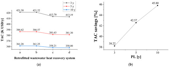 First, sensitivity analysis of on TAC was conducted because could be changed depending on the situation of the textile plant. Thus, as shown in Figure 7, sensitivity analysis of TAC was conducted by changing to 3 years and 10 years. Figure 7a represents the TAC of each retrofitted system as the changes, and Figure 7b shows the maximum possible TAC savings as the changes.